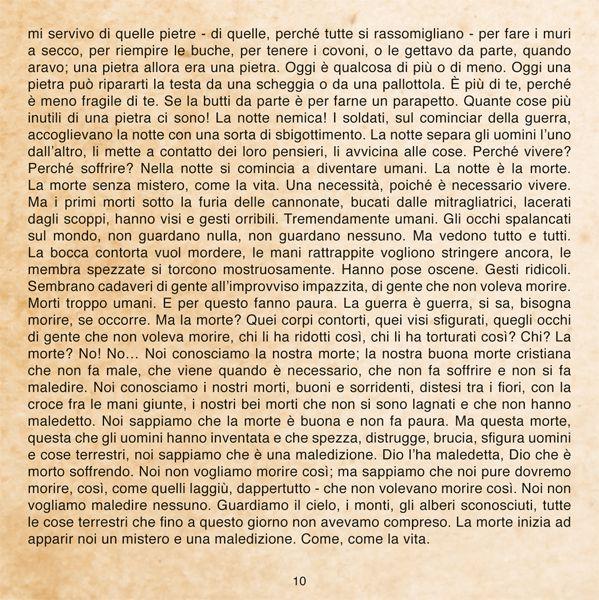 Le granate, le bombarde, le torpedini scoppiavano da tutte le parti in uno spazio di pochi metri quadrati; nuvole di fumo e di polvere s'alzavano intorno a noi, oscurando il sole; sassi e terra piovevano sul cocuzzolo brullo; gli shrapnels schiantavano nell'aria inondandoci di pallottole, per fortuna innocue, e le loro nuvolette, bianche, nere, rosee parevano indugiarsi proprio sopra di noi per indicare il bersaglio ai nemici. Ogni tanto un tonfo più formidabile, un 305, faceva sobbalzare il suolo; e allora sembrava che persino il cielo oscillasse e si scolorasse di sgomento. Era nel pensiero di ognuno di noi che ciascun attimo in quell'inferno era l'ultimo della nostra esistenza. Ci guardavamo, trattenendo il respiro, preparati ormai al sacrificio imminente, come vittime rassegnate al loro destino fissato dall'eternità. Il sole, quasi allo zenit, ci schiacciava con le sue fiamme implacabili; il cielo bianco a forza di esser limpido ci abbarbagliava; la terra smossa della trincea ardeva e si sfaldava piano piano; le nostre membra bollivano ammassate in quell'afa ristretta. Non saprei dire quanto restammo in quell'attesa di un colpo che ci sfracellasse e mettesse fine alla nostra agonia. So invece che a un certo punto i nostri spiriti si sollevarono d'improvviso, come se avessimo superato il limite massimo di un angoscia istintiva, e una gaia serenità si diffuse fra noi. No, tutto era troppo terribile e assurdo per considerarlo al modo naturale: meglio divenire assurdi anche noi, denudarci della nostra umanità, come sempre ci si denuda in guerra, davanti alla morte, la cui presenza fa tutti belli e puri. Tirammo fuori, chi la sigaretta, chi la pipa, e ci mettemmo a fumare e a motteggiare. La tempesta delle cannonate, degli urli, dei rombi, dei sibili continuava. Continuasse pure; noi ridevamo intanto per l'ultima volta, trasfigurati in una sorta di luce tragica che ci rendeva grandi.